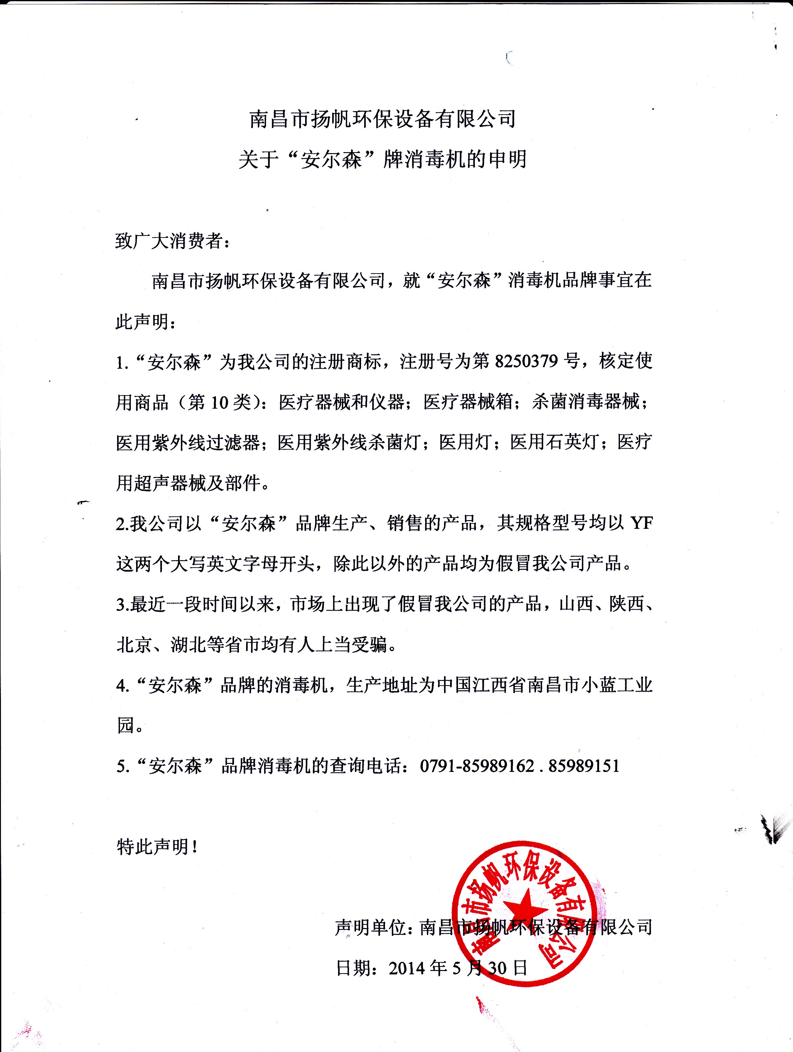 南昌市揚帆環保設備有限公司,就“安爾森”消毒機品牌事宜在此聲明: